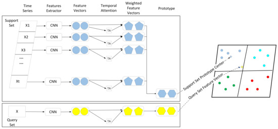 The training of the prototypical network with temporal attention comprises two parts. First, the embedding function CNN network with learnable prototype parameters maps the data stream into the embedding space , yielding the embedding vector . Next, time attention is calculated for the embedding vector, and the resulting attention weight is multiplied by the feature vector to obtain a weighted feature representation. The weighted feature representations of all the time points are summed to produce the final weighted vector z, which encapsulates the information of the entire streaming data and places greater emphasis on those time points assigned higher weights, as follows: