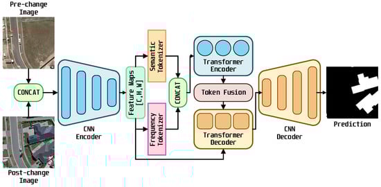 In more detail, the CNN encoder and decoder comprise four down-sampling 3 × 3 convolutional layers and four up-sampling 3 × 3 convolutional layers, respectively. Each convolutional layer consists of two 3 × 3 convolutional blocks with batch normalization (BN) and a rectified linear unit (ReLU) activation function and a 2 × 2 max pooling layer or a 2 × 2 bilinear interpolation layer to acquire multi-scale feature maps. When conducting the CD procedure, the pre-change and post-change remotely sensed images are fused in the channel dimension at the early stage and input into the CNN encoder; this has been validated as beneficial for CD tasks [29]. Then, the multilayered feature maps are obtained by the CNN encoder for the subsequent change information extraction and refinement. Among these multi-level features, the deepest features with the smallest spatial size and the largest channel size are input into the semantic and frequency tokenizers to acquire semantic tokens and frequency tokens, which comprise rich semantic information and frequency information, respectively. The acquired semantic tokens and frequency tokens are concatenated at the channel dimension and input into the Transformer encoder with positional embeddings, which can integrate the location information, semantic information, and frequency information to better extract the change information. Moreover, the encoded tokens will be further fused by a 1 × 1 convolutional layer to acquire more fine-grained change feature representation. Afterwards, the fused tokens with rich semantic and frequency information and the features from the deepest layer of the CNN encoder are input into the Transformer decoder to acquire both the semantic-rich and frequency-rich features, which promote the accurate concentration of change information during the decoding stage in the CNN decoder. Then, the changed land cover is annotated in the pixel-wise prediction after being decoded by the CNN decoder. To increase clarity, the overall CD pipeline of the proposed D2Former is shown in Algorithm 1.