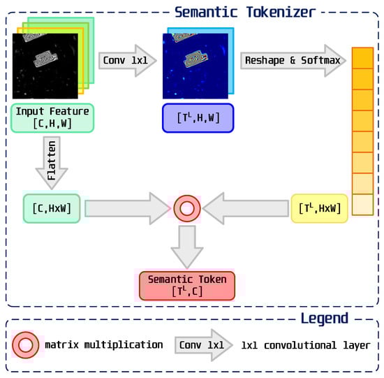 In the first place, let the input features be , where C, H, and W represent the channel size, height, and width, respectively, of the input features of the semantic tokenizer. To concentrate meaningful semantic information in the input feature maps, a 1 × 1 convolutional layer is firstly applied, which can be represented as: