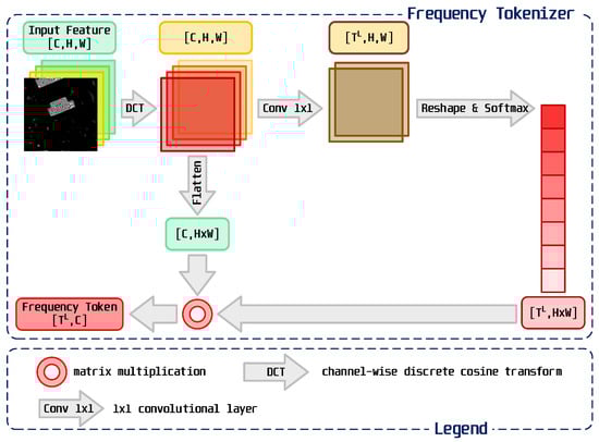 Firstly, let the input features be , where C, H, and W represent the channel size, height, and width, respectively, of the input features of the frequency tokenizer. To focus on essential frequency features within the input feature maps, we first apply a convolutional layer with a kernel size of 1 × 1; this can be depicted as: