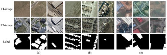Some examples from the three experimental datasets: (a) WHU-CD dataset, (b) LEVIR-CD dataset, and (c) GZ-CD dataset.