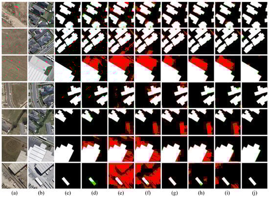 The visual results for different methods on WHU-CD dataset: (a) T1-time image, (b) T2-time image, (c) ground truth image, (d) FC-EF [29], (e) FC-Siam-C [29], (f) FC-Siam-D [29], (g) STANet [30], (h) BIT [36], (i) ChangeFormer [37], and (j) proposed D2Former. Note: white, black, red, and green denote true positive pixels, true negative pixels, false positive pixels, and false negative pixels, respectively.