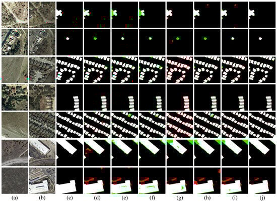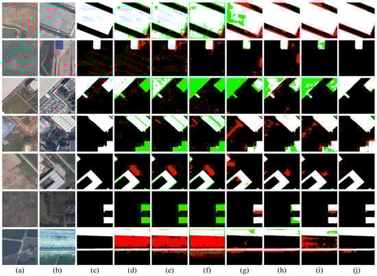 The visual results of different methods on the GZ-CD dataset: (a) T1-time image, (b) T2-time image, (c) ground truth image, (d) FC-EF [29], (e) FC-Siam-C [29], (f) FC-Siam-D [29], (g) STANet [30], (h) BIT [36], (i) ChangeFormer [37], and (j) proposed D2Former. Note: white, black, red, and green denote true positive pixels, true negative pixels, false positive pixels, and false negative pixels, respectively.