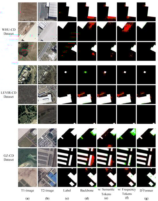 In this section, to further explore the effectiveness of the proposed D2Former, we performed sufficient ablation experiments using three experimental datasets: WHU-CD, LEVIR-CD, and GZ-CD. First, we carried out experiments using different components of the proposed D2Former on these three datasets. Then, we visualized the features when using different components on the WHU-CD dataset to intuitively analyze the improvement of the feature representation ability of the proposed D2Former. Ablation experimental details are as follows.