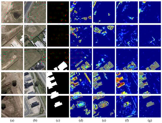 In addition to quantitative comparisons, visual results are also compared to further validate the superiority of our method. Figure 5 presents some representative examples on the WHU-CD dataset for the change maps of various approaches. Observing Figure 5, we can see that each method can effectively detect changed buildings, and there are few missed detections. However, many methods inevitably suffer from a wide range of false detections. For example, as shown in the third row of Figure 5, almost all comparison methods present large areas of red false-detected pixels. The reason is that the characteristics of ground objects with similar materials, structures and spectra as buildings are difficult to effectively distinguish from the features of buildings, which interferes with the recognition of building targets and leads to large areas of erroneously detected pixels. A similar situation occurs in the last row of Figure 5. Notably, compared with the selected comparison methods, the proposed D2Former demonstrates better results in these examples and shows very few red misdetected pixels and green missed pixels in large-scale or small-scale target scenes. On the whole, the proposed approach also exhibits obvious advantages in visual results: providing the same conclusion as the quantitative comparison.