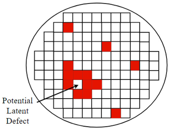 Potential latent reliability defect in EDS wafer map. Red chips are defective chips. The normal white chip surrounded by defective chips can be a reliability defective chip.