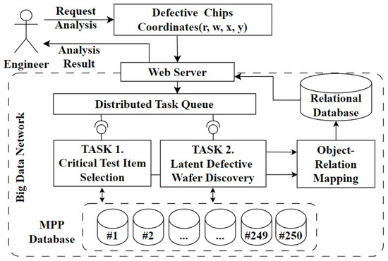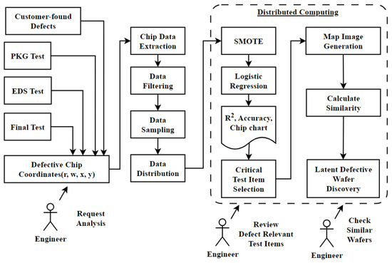 When analyzing imbalanced data in a semiconductor domain, we encounter two typical problems. First, if the root cause search in the FAB process is performed based on a small number of defect chips, too many pathways come to the surface, and it is hard to determine the root cause. Another problem is that when a correlation analysis with an EDS test is performed based on a small number of defects, the result value loses discrimination power due to the extremely imbalanced data. To mitigate such a problem, we chose Logistic Regression (LR) as a classifier, which can intuitively express defect correlation. We added the Synthetic Minority Over-Sampling Technique (SMOTE) as a preprocessing logic to improve the interpretation and intuition of [3]. Yi et al. [4] developed the MC-SMOTE oversampling technique for detecting wind turbine blade icing defects and improved predictive performance. The second problem is that the data size is increased by the number of net dies (1 wafer = 1900 chips), and a huge amount of time is required to obtain the result. To solve this problem, we adopted MPP (Massive Parallel Processing) architecture and converted the necessary data processing into a parallel processing form. The Massive Parallel Processing database adopts the SHARE-NOTHING distributed parallel processing flat architecture [5,6,7]. Timely analysis can be achieved by using MPP architecture to analyze rapidly generated semiconductor data. The rest of this paper is organized as follows. Existing methods for detecting semiconductor defects are reviewed in Section 2. The proposed methods to find the defect-relevant EDS test and the FAB root cause are reviewed in Section 3. The strategies for optimizing chip-level big data are reviewed in Section 4. The experimental result is summarized in Section 5. This paper concludes in Section 6.