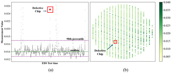 Visualizations for defective chip analysis. (a) The scatter chart of chips shows that a defective chip’s measurement value is in the outlier range. (b) The wafer map chart shows that the defective chip is in the line patterns.