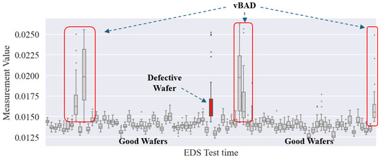 Table 2 is a correlation rank table obtained by investigating the metal bridge defect case. Rank 1 “Voltage X” test item’s DCI is 0.99, is 0.91, and its accuracy is 0.99, which means statistically very relevant. Figure 7 shows additional visualizations of the first rank “Voltage X” test item. Using these visualizations, we can find abnormalities in the time-series trends of chip data or spatial patterns in the wafer map chart. We amplify defective wafer samples based on the selected critical item and threshold value found in the previous step. Figure 8 shows the box-plot diagram grouped by wafers. We classify similar wafers to defective wafers as bad wafers and others as good wafers. Figure 9 shows the conceptual root cause analysis with amplified wafers.