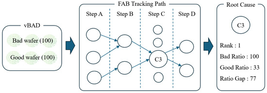 In this example, “C3” equipment in step “C” is the most suspicious root cause. For root cause analysis, we used the legacy in-house root cause search. The primary goal of our legacy in-house root cause analysis is to identify the common paths that bad wafers have taken. To pinpoint equipment that may be causing specific defects, we calculate the proportion of input bad wafers that pass through each equipment, which is known as the bad ratio. Similarly, we determine the proportion of good wafers that pass through each equipment, which is referred to as the good ratio. Finally, we calculate the difference between the bad wafer ratio and the good wafer ratio for each equipment, which we call the ratio gap. This metric helps us identify the root cause of the defects. The analysis engineer usually registers the defective wafers as “bad wafers” and the high yield as “good wafers” and executes the root cause analysis system. However, as we have discussed, since the number of defects in the real world is extremely limited, it is hard to find the root cause. Table 3 shows this limitation of a root cause search with a single defective wafer. Since there is only one bad wafer, all equipment has only two ratio gaps (76, 77%), and it is hard to determine the root cause. “E051” equipment at step “10” is a known root cause, but “E051” equipment ranked 404, and most of the equipment’s ratio gap is identical or very close.