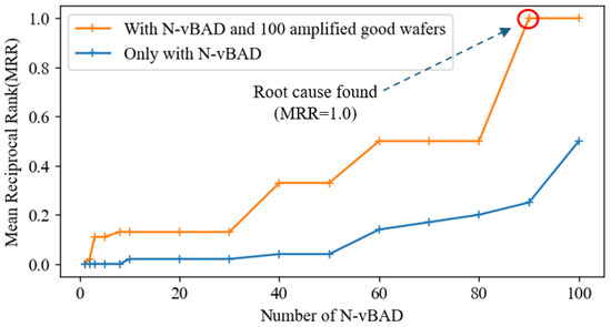 In contrast, Table 4 shows the result of the root cause search with 90 vBADs. “E051” equipment ranked first, with a bad ratio of 100%, a good ratio of 23%, and a gap of 77%. Figure 10 shows the overall root cause search performance by the number of vBADs. We utilized the Mean Reciprocal Rank (MRR) as a search performance metric. We fixed the number of good wafers to 100 to better observe the effect of the number of vBADs. The experimental result shows that the MRR of the root cause search with 90 vBADs reached 1.0, while the MRR of the root cause search with a single bad wafer is extremely low (0.0002). This proves that utilizing vBADs increases the accuracy of the root cause search. Additionally, the MRR of the root cause search with both 90 vBADs and 100 amplified good wafers is 1.0, while the MRR of the root cause search with 90 vBADs is 0.25. This proves that the root cause search with N-vBADs and amplified good wafers performs better than the root cause search only with N-vBADs. In summary, the experimental result shows that amplifying defective and good wafers can dramatically increase the accuracy of root cause search. The prior approaches solely detected low-yield wafers and applied them directly to the root cause search. However, when there is only a limited number of wafers or chips, the root cause search cannot provide the differentiated root cause. In the circumstance of a lack of defective chips, which is very common in the semiconductor industry, our proposed method is essential and enables us to find the most correlated test and the most suspicious root cause, even with limited customer-found defects.