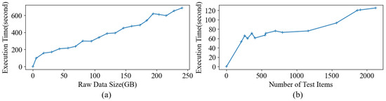 System parameters affecting the performance. (a) Data size affects the performance. 50 GB on average, 200 s elapsed. (b) The number of test items affects the performance. Test item counts are 2200, and 120 s elapsed.