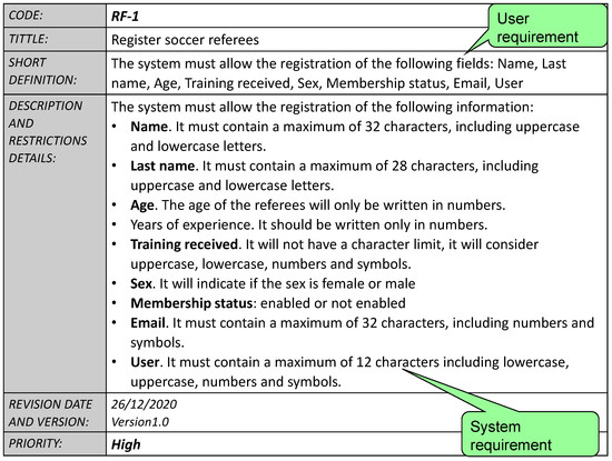 The “Description and constraints details” section of the SURE format should describe information useful to software developers, such as the length and data type of each attribute, in addition to the brief explanations provided in the preceding section. For instance, Table 2’s brief description of the title requirement “Register soccer referees” includes information on each of the characteristics, which is displayed in detail in Figure 3. In some cases, it is necessary to provide the format in which the data will be represented. An example of this would be “MAT00001”, which is a registration code consisting of five integers after the prefix “MAT”.