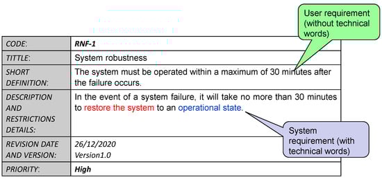 Templates proposed for expressing FRs and qt-NFRs, such as EARS [23] or that presented by [22] for the case of FRs and NoRTs [24,25] for the case of qt-NFRs, can be used within step 2 to describe user requirements. However, we have proposed two structures to facilitate the unambiguous definition of both FRs and qt-NFRs. Below are specifics on the structures and how the three main sections of the SURE format should be filled to define FRs and qt-NFRs.
