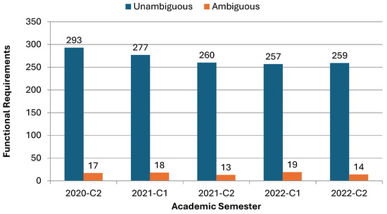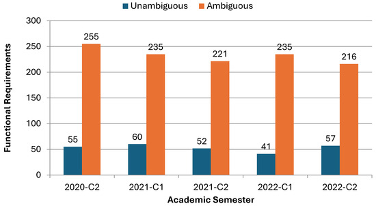 Conversely, Figure 6 displays the findings of the assessment of the FRs that were gathered following a class in which students corrected the requirements to comply with the CRUDE structure. It shows that, for each semester, the majority of the experts have determined that over 200 requirements are unambiguous, while less than 20 requirements—or less than 10% of the requirements—have been deemed unclear by them.