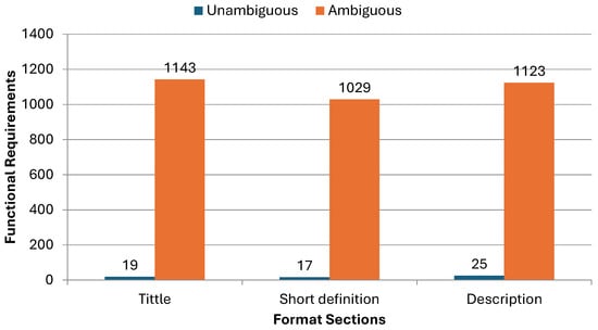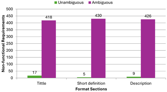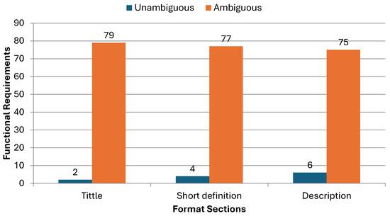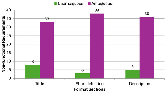In total, 46 requirement specification documents from the University of Guayaquil’s RE courses taught between 2020 and 2022 were taken into consideration to assess the improvement in the definition of FRs and qt-NFRs while using the proposed structures. To evaluate its applicability in business systems, five experts from the fields of software development and business management assessed the ambiguity in FRs and qt-NFRs of the requirements specification documents. The results demonstrated that the percentage of unambiguous FRs and qt-NFRs decreased from more than 80% to around 10% when the structures recommended in this study were put into practice. Moreover, much of the uncertainty in FRs originates from the requirement title specification. Nonetheless, it is simpler to define clear FRs when the title is clear. On the other hand, much of the ambiguity in qt-NFRs originates in the specification of their short definition. However, it is easier to define qt-NFRs when the values of the suggested metrics are defined within the PROSE structure. Overall, the results show how important the three structures presented in this manuscript are when helping the student define unambiguous requirements.