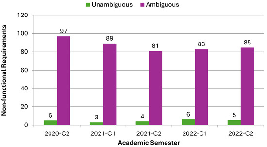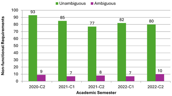 Conversely, Figure 10 displays the findings of the assessment of the qt-NFRs of the projects that were gathered following a class in which students corrected the requirements to comply with the PROSE structure. It shows that each semester, the majority of the experts have determined that close to 90% of qt-NFRs are unambiguous, while less than 10 requirements—or close to 10% of them—have been deemed unclear by experts.
