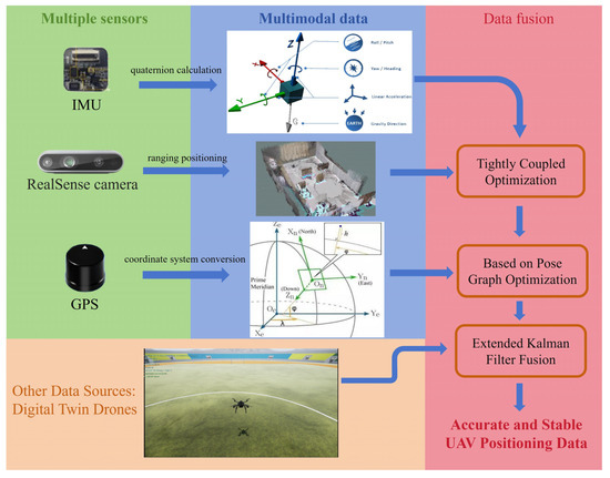 Figure 1, this method initially utilizes various sensors, including GPS, IMU, and visual sensors, to acquire multimodal data. The IMU performs quaternion calculations to obtain attitude data, the RealSense camera provides environmental depth information as well as distance positioning, and the GPS performs coordinate system conversion in addition to providing global positioning data. These data are combined through tightly coupled optimization, integrating visual and inertial navigation data. The GPS fusion, based on pose graph optimization, is further refined, and the digital twin UAV is used as a critical data source. The extended Kalman filter (EKF) algorithm is employed to achieve data fusion between the real UAV and its digital twin.