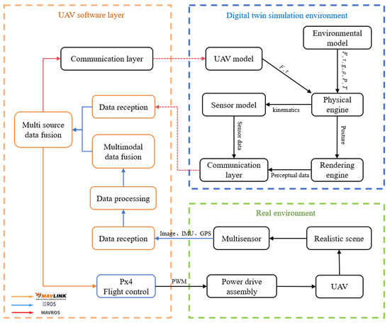Figure 2. This diagram depicts a multisource and multimodal data fusion system primarily deployed in UAV software layers and digital twin simulations. During the digital twin simulation process, sensor models provide the UAV flight control with sensor information obtained from the simulation environment. The flight controller computes the current state estimates and outputs actuation signals to the UAV model, which calculates the required forces as well as torques and assigns motor voltages. Additionally, inputs such as drag, friction, gravity, and torque are used by the physical engine to compute the UAV’s next motion state in the simulation environment, and the estimated data are relayed in real time to the physical UAV. The UAV dynamics information, enriched with environmental model data like gravity, air density, atmospheric pressure, magnetic fields, and GPS coordinates, is then transmitted back to the sensor model, creating a feedback loop that captures sensor-acquired data. On the UAV’s physical side, the system encompasses data collection, processing, and algorithmic fusion, utilizing raw data from the IMUs and GPS, along with environmental information captured by depth cameras. It also receives real-time location estimates from the digital twin UAV, which are fed into the data fusion module. The data fusion and control execution section form the core of the system. Here, data from various sensors are integrated to enhance positioning accuracy and robustness. The fused information is used to generate precise flight control signals, which are subsequently transmitted back to the UAV flight control through the MavLink control protocol, achieving accurate flight control.