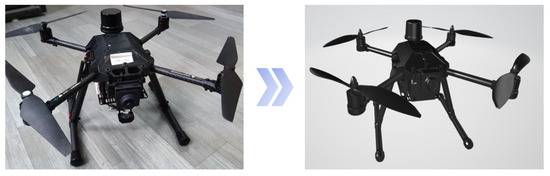 Figure 4, which depicts the UAV’s external features, part dimensions, and material types, among other fundamental indicators. This process ensures a high-fidelity construction model of the physical UAV, enabling the digital twin system to accurately replicate the real UAV. This underpins subsequent digital twin UAV flight experiments by providing a fundamental model support, mitigating disparities between flight experimental results and actual conditions that may arise due to differences in geometric model parameters. Furthermore, it facilitates the development and testing of interfaces between the virtual and physical domains within digital twin technology.