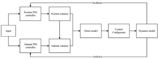 Figure 5. In the diagram, the input signals, after filtration, are separately directed to the position PID controller and the attitude PID controller. The position PID controller takes the UAV’s altitude value signal, which is linked to the UAV’s NED (north, east, down) coordinate system. The signal represents the difference between the set target altitude and the actual flight altitude, with the controller’s output being the vertical acceleration. The attitude PID controller receives the UAV’s horizontal displacement signals, which are related to its horizontal coordinates. Its values represent the discrepancies in the UAV’s roll, pitch, and yaw angles from the set horizontal target values to their actual values, with the controller’s output being the horizontal acceleration. Through position and attitude calculations, the system converts the input quantities allocated to each direction into PWM (pulse width modulation) control signals, which are then sent to the motors. This process controls the motors, ensuring the precision of the UAV’s flight control.