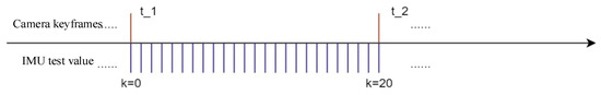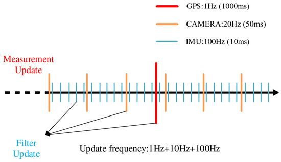 21], where the update timing nodes are the same as the IMU data measurement nodes. Other sensors act as auxiliary sensors to correct IMU data, and their update nodes must be on the IMU update nodes. Due to the different data acquisition frequencies of various sensors, it is necessary to synchronize the timing of various data at the fusion center, which can determine the best sequence for fusion [
