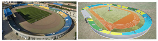 Furthermore, to validate the effectiveness of the digital twin system, this study first established a virtual external testing environment as a primary prerequisite for digital twin testing. To conduct more accurate experiments with the drone digital twin system, the actual experiment environment the school playground was modeled in multiple dimensions. Three-dimensional scene real images and model diagrams are shown in