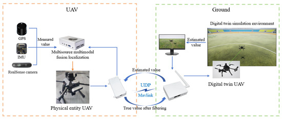 Figure 12. On the physical drone end, various sensors such as GPS, IMU, and RealSense cameras collect pose data in real time. These data are transmitted to the drone’s onboard computer for processing and multimodal fusion. The ground-based digital twin platform serves as the virtual part of the experiment, receiving the drone’s location information in real time, using it as a reference value, and combining it with the digital twin model to calculate the drone’s pose. The calculated pose information, in the form of estimated values, is transmitted back to the drone via data transmission modules using UDP network and MAVLink communication protocols. The drone’s onboard computer receives these estimated values and further fuses them with the measurements obtained from its own multisensor fusion using the extended Kalman filter (EKF) algorithm to optimize the accuracy of pose estimation. The extended Kalman filter, through its iterative prediction and updating process, corrects the drone’s real-time pose, thereby reducing estimation errors.