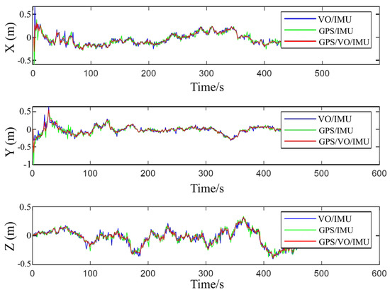 Figure 13 show that the GPS/VO/IMU combination navigation method exhibits smaller positioning errors and higher stability. This finding suggests that the fusion of GPS, VO, and IMU data in drone positioning can effectively suppress errors that may arise from individual systems, reduce positioning fluctuations caused by the performance variability of a single system, and significantly enhance overall navigation accuracy. Compared to using VO/IMU or GPS/IMU alone, the GPS/VO/IMU combination not only provides more accurate location information but also maintains stable system performance under complex environmental conditions.