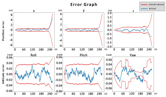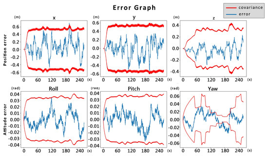 Figure 14 showcases the distribution of positional and attitudinal errors and the covariance of the drone system before applying the data fusion technique proposed in this paper. From the figure, it can be observed that although the system can maintain errors within a relatively small range in the initial phase, indicating a certain degree of accuracy and stability in the short term, the errors in position and attitude exhibit a trend of gradual increase over time, manifesting as a systematic drift phenomenon. This drift leads to the divergence of covariance, reflecting an increase in the uncertainty of system state estimation. The performance degradation of the system indicates a lack of effective error correction mechanisms during long-term operation, ultimately leading to the inability of the drone’s navigation system to maintain a normal working state, thereby validating the insufficiency of single-sensor or unoptimized multisensor systems in maintaining long-term positioning stability.
