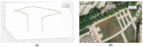 Figure 17b, the area marked with an orange ellipse indicates the trajectory when the drone was near tall buildings and the number of satellites was fewer than six. It can be seen that the position data from the PX4 flight control system, which relies on GPS signals, began to drift and fluctuate, whereas the position estimated by the fusion algorithm only exhibited minor oscillations and remained stable. Additionally, in