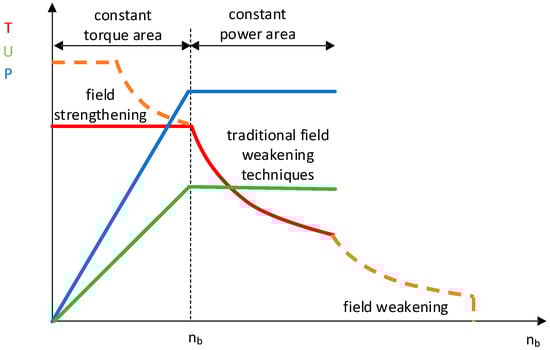 Modern electric machines with permanent magnets are also required to operate at a wide range of rotational speeds. The speed control of the machine below the base speed is achieved by regulating voltage at the maximum allowable current for the stator windings. This operating range is known as constant torque operation. Once the nominal values of voltage and currents are reached, the machine rotates at the base speed . Operation above this speed is only possible by weakening the main magnetic flux in the machine, which can be achieved through appropriate techniques of controlling the machines’ currents in the stator winding. This operating range is referred to as constant power operation because as the rotational speed further increases, the power remains at the same level, but the torque on the machine’s shaft decreases. The further weakening of the field can be achieved by introducing an additional, adjustable excitation source. Figure 2 presents the mechanical characteristic of a machine with hybrid excitation, illustrating the dependence of the electromagnetic torque (T—red color) voltage on the windings (U—green color) and the dependence of electric power (P—blue color) on the rotational speed n. The possibility of modifying the electromagnetic torque through techniques for enhancing or weakening the magnetic field in the machine using an additional excitation source is indicated in orange color. An additional excitation source can be installed in series or in parallel with the primary excitation source [,,,].