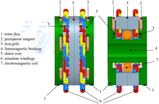 The electromechanical energy converter design under consideration is a disc type machine with one double-wound stator and two external discs connected via a ferromagnetic bushing, forming the rotor of the machine (Figure 3) [,].