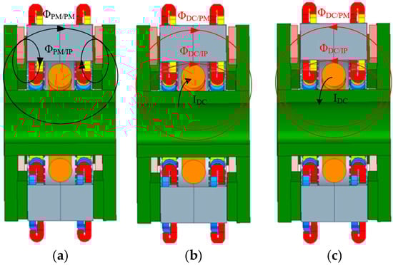 Distribution of magnetic fluxes in the machine for different currents in an additional electromagnetic coil: (a) , (b) , (c) .