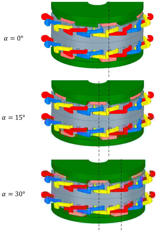 The aim of this publication is to analyze the parameters and efficiency of the machine when changing the geometry of the magnetic circuit, which involves rotating the rotor discs relative to each other. This is possible because of the rigid connection of the rotor discs with each other by a ferromagnetic bushing. The discs were rotated by an angle α = 0÷30° mechanical, which is equivalent to shifting by half of a magnetic pole. It was assumed that increasing the angle α beyond 30° would cause symmetrical changes. The shifts of the rotor by three characteristic angles α = 0°, α = 15°, and α = 30° are presented in Figure 5.