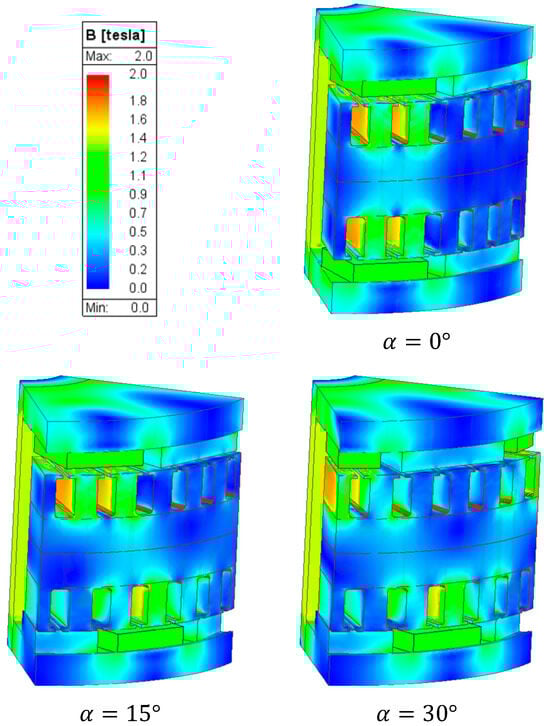 The simulation studies were conducted using the Finite Element Method in the ANSYS Maxwell environment. To reduce the computation time in the simulation studies, one-sixth of the model was analyzed, and the obtained results were calculated to represent the parameters of the entire machine. In the model, boundary conditions were adopted whereby the magnetic field at the model’s cut planes satisfies symmetry conditions, and the magnetic field does not extend beyond the analyzed area in the space around the model. All of the typical relevant simplifications have been performed. The slot opening cannot be more simplified, because the results of the magnetic field induction will be inconsistent with the theory. The distribution of magnetic field induction in the machine depending on the angular displacement between the rotor discs with the auxiliary coil de-energized is presented in Figure 6.