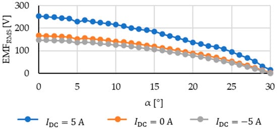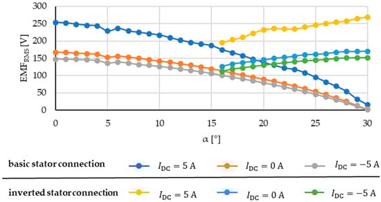 The first set of studies involved the simulation of Electromotive Force (EMF) induced in the stator windings. The studies were performed in an unloaded state, and the machine rotated at a speed of 1000 rpm. The studies were carried out for three forced currents in the windings of the additional DC coil: , (which is the state of de-excitation of the machine), and (which is the state of over-excitation of the machine). The relationship between the effective value of EMF and the angle of disc displacement α is shown in Figure 8.