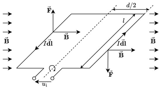 A frame made of wire is placed in a homogeneous magnetic field as shown in Figure 1 [9]. The current I is flowing through the wire of the frame. In this special case, when the vectors and are perpendicular to each other, the Lorentz force equation has the simple form of , where l is the side length of the wireframe, and is the constant magnetic flux density amplitude. The Lorentz force is constant, and perpendicular to the magnetic field and the frame side, too.