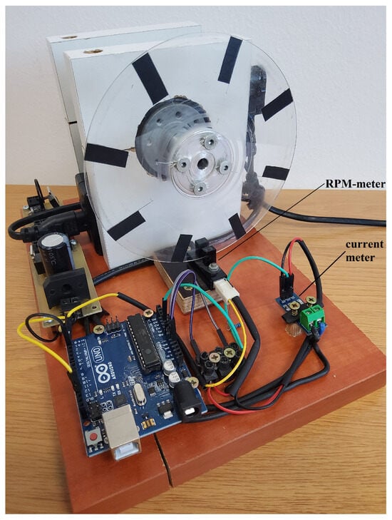 The type of permanent magnet low-power motor under test is Transtecno EC020.120 [51]. The nominal power is 20 W, and the nominal speed is 2850 RPM (round-per-minute). The motor speed is measured by a disc (with eight black glued strips evenly spaced at ) rotating between the transmitter and receiver sides of a Sharp GP1A22LC optocoupler [52]. The speed measurement has been implemented in the microcontroller with an interrupt. The type of Hall-element sensor used to measure the current is ACS 712 [53], which can be easily interfaced with the Arduino controller [50]. Here, the well-known Arduino UNO microcontroller has been installed. Details of the power supply and the electronics controlling the motor can be found in the thesis [54].
