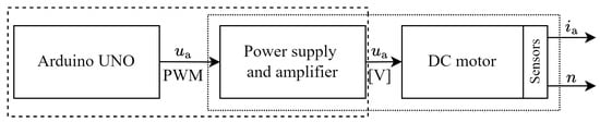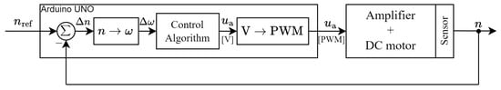 In a closed loop arrangement, i.e., control as known from control theory, the speed and in some cases also the current signals are fed back, as shown in Figure 4. In this work, the main control objective is speed control, so this signal is always fed back. The feedback of the current signal is indicated by a dashed line, highlighting that it is not always used (current is necessary only in the case of state feedback control, for simple PID it is not essential). In the case of control, the microcontroller does not just record the measured signals but uses them for control.
