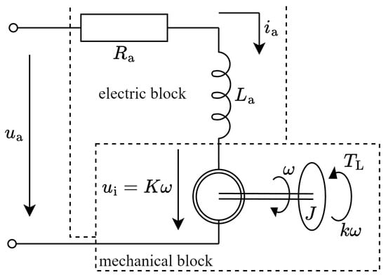 The DC motor equations can be written using the equivalent circuit diagram shown in Figure 5 [3,4,5,6,9,17,20,21]. The excitation of the armature is the terminal voltage , also called the armature voltage and the armature current in the rotor winding is denoted by . The electric block represents the armature circuit, which can be modeled as a simple serial-connected RL circuit, and the voltage induced by the rotation of the rotor acts against the armature voltage so that it is connected in series with the RL circuit in the model, thus reducing the voltage on the RL-elements. The negative sign shown in the introduction is neglected by this reference direction. The mechanical block of the model describes the rotation of the rotor and the mechanical characteristics of the rotational motion.