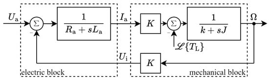 The Laplace transform can be easily used to draw the block diagram shown in Figure 6. Here, it can be clearly seen that the input of the electric block is the voltage and the output is the current , from the first equation of (11)
