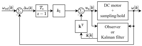 The eigenvalues of the extended system matrix, i.e., the poles of the extended system, are , , and . The last one is due to the integrating effect, the other two poles are from the discrete-time model of the motor.