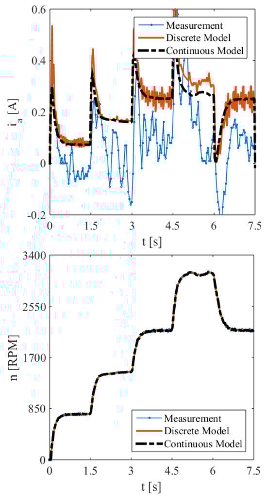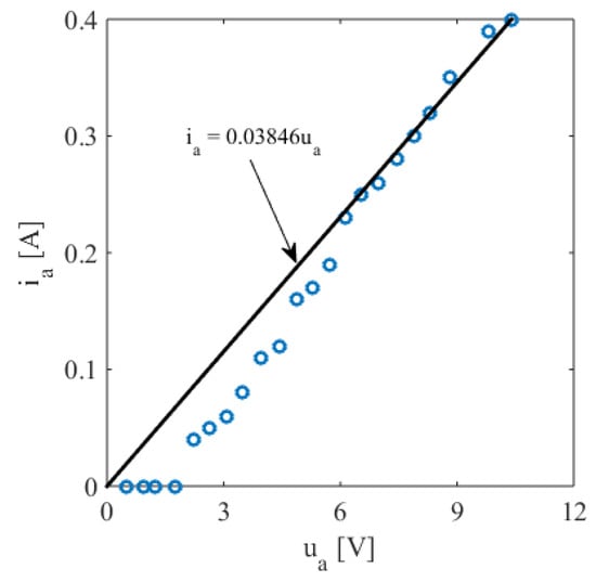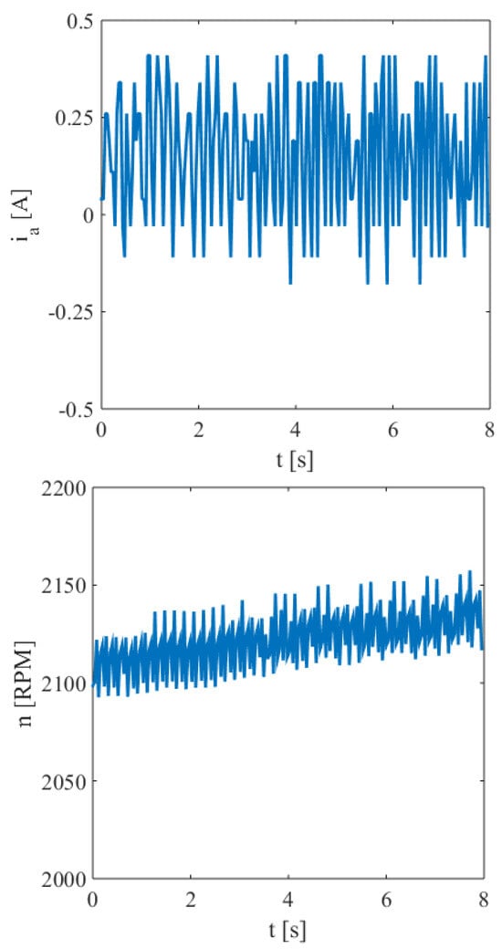 The open-loop measurement is presented in Figure 3 means that the Arduino microcontroller controls the motor according to a predefined time-dependent voltage signal , and the measured current ; the speed waveforms are only recorded for further use. The measured data are fed to the computer via a serial port. This setup is suitable for testing the motor and taking measurements to be recorded for model identification. The index ‘a’ stands for the armature coil, which is fed by the voltage and the current flowing through the coil is . In this permanent magnet motor, the armature coil is wound on the rotor. Open-loop measurements are useful for system identification, because motor model parameters are not provided by the manufacturer, i.e., model parameters must be identified via measurements.