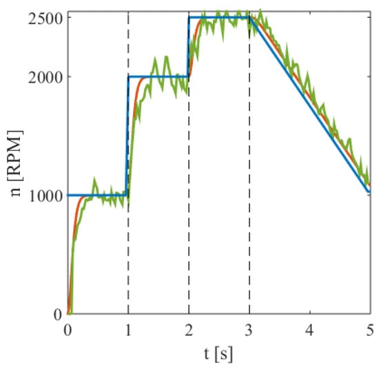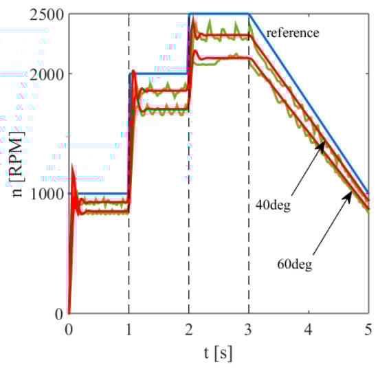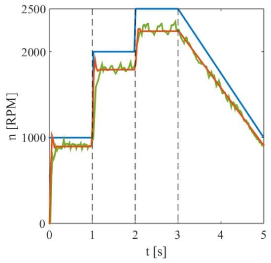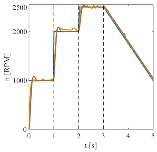 In the first case, the poles and are not moved, the pole is changed to , i.e., the pole connected to the integrator is accelerated. This gives the following gains using Ackermann’s formula (see Figure 24, where reference, measured and simulated signals are the blue, green and red lines):