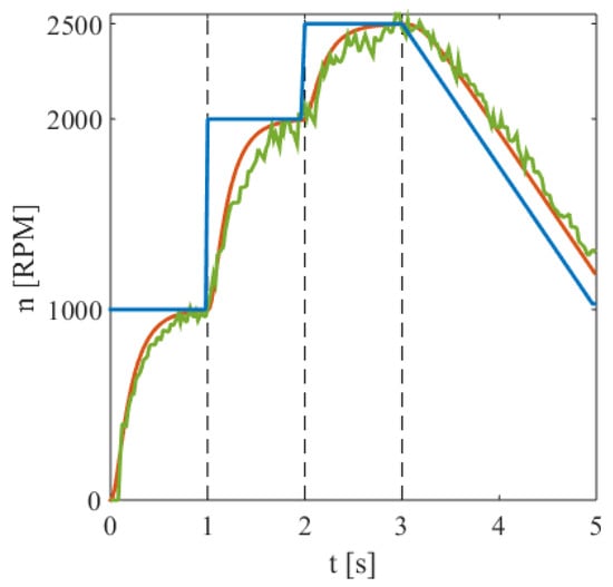 As a result of the experimentation with pole placement, further modification of (e.g., to or ) has practically no effect on the behavior of the closed loop. Changing the pole also has no effect on the controlled characteristic or the control signal. Moving the pole is more significant. At the following values, as in the second case, the control signal does not exceed the upper limit, but a faster settling is obtained compared to the previous one (see Figure 25, where reference, measured and simulated signals are the blue, green and red lines):