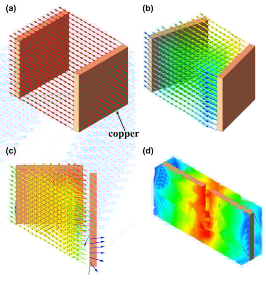 Transition of a parallel to a coplanar copper electrode capacitor (the colors in the figure reflect the electric field intensity and follow the distribution of a rainbow): (a) ideal parallel electrode capacitor; (b) e-vector in open transition with copper electrodes opening angle of 30 degrees; (c) e-vector in open transition with copper electrodes opening angle of 90 degrees; (d) Mag-E in coplanar electrode capacitor.