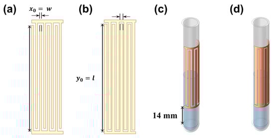 The first consideration is a set of parameters on the plane, namely, the interdigital electrode’s lateral width () and longitudinal length (). Figure 4 shows that these lengths are (1, 39) and (1.5, 39.5) in millimeters, respectively. Also, Figure 4c,d indicate the simulation model with different sizes of IDT electrodes. The IDT electrode adhering to the test tube is at a height of 14 mm above the circular bottom of the cylinder of the test tube. The thickness of the copper foil is 1 OZ (0.035 mm).