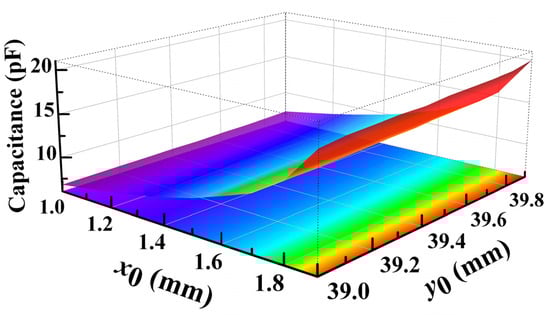 Solving Equation (4) for numerically by specifying the boundary conditions yields the potential distribution function within the three-dimensional field. Subsequently, the capacitance value can be computed by employing the capacitance calculation formula, written as follows: