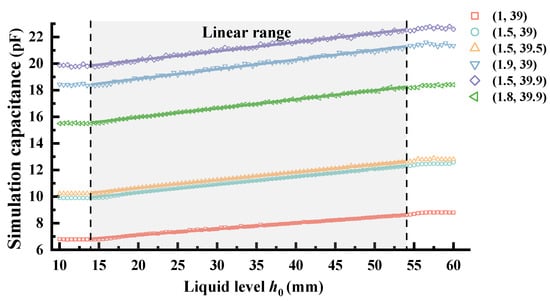 It can be observed in Figure 5 that as and increase, the capacitance of the electrodes also increases, ranging from a minimum value of 6.79 pF to a maximum value of 20.01 pF. This observation aligns with Equation (1). However, the effect of the longitudinal metalization ratio on the capacitance of the electrodes is relatively small compared to the lateral metalization ratio. Therefore, it is considered to set both the lateral and longitudinal metalization ratios to 90%, corresponding to (1.9, 39). Six sets of data were simulated for practical applications, corresponding to electrode dimensions of (1, 39), (1.5, 39), (1.5, 39.5), (1.9, 39), (1.9, 39.9), and (1.8, 39.9), respectively, for liquid level heights ranging from 10 mm to 60 mm. The scatter plot of capacitance values at different liquid levels and the fitting lines obtained using the least squares method are shown in Figure 6.